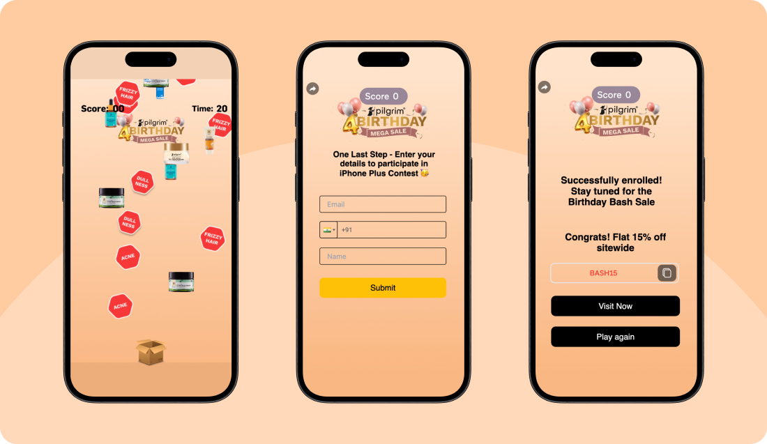 Pilgrim, neatly integrated a lead form into the gamified experience, strategically positioned right before disclosing coupon codes. This clever placement motivated users to willingly provide details like mobile numbers and emails in exchange for the exciting discounts. Impressively, more than 60% of users who engaged with the game ended up willingly sharing these valuable details, enriching Pilgrim's database for future marketing efforts.