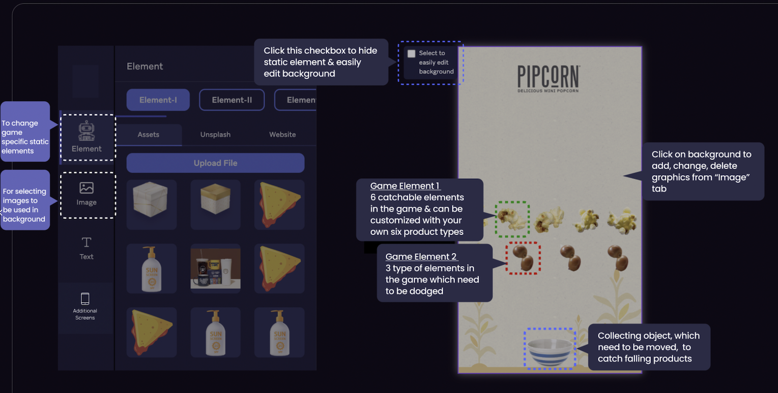 Catch & Dodge is an engaging game where players collect falling objects or products, accumulating points for each item caught. At the same time, they must dodge negative or undesirable elements that subtract from their score. All within 30 seconds. With each play, users get familiarized with your flagship products or features as they aim to collect them, while also becoming aware of what your brand explicitly does not offer or stand against. This dual approach makes it a powerful game to engage, educate & convert
