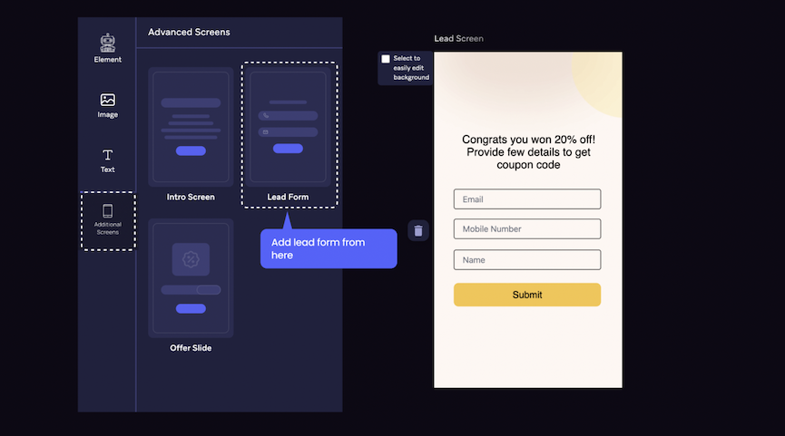 Users are 2-3X more likely to share first-party data like email or phone numbers after an engaging and rewarding brand experience. To add a lead capture screen, go to the "Advanced Screen" tab on the left & select "Lead Form"