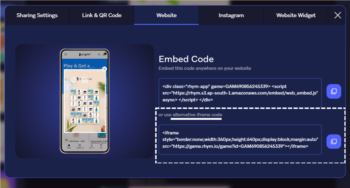 3. If your site or LMS doesn't support scripts you may also Copy & Paste the **alternative iframe code**