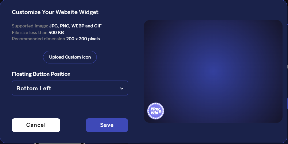 5. Follow the instructions and upload a "custom icon", set the "position" and click on "Save". For example: Here I've uploaded a custom icon and placed it on bottom left corner